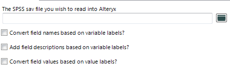 The concept of SPSS Variable Labels is pretty much the same as Alteryx field descriptions, so the second tickbox there is basically recreating the original SPSS setup but in Alteryx. You will see the field descriptions in Alteryx tools like the select tool in that case – or you have the first option which literally replaces the coded field names with their SPSS descriptions if you prefer.