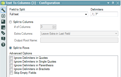- Despite its name, it has a configuration option to split your text to rows, rather than columns.This is great for this type of thing because each field might contains a different, and unknown amount of words in in – and for most analytic techniques it is often easier to handle a table of unknown length than one of unknown width.