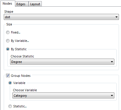 - ability to group nodes by either network statistics or another variable (e.g. to differentiate between Facebook friends and Facebook groups).