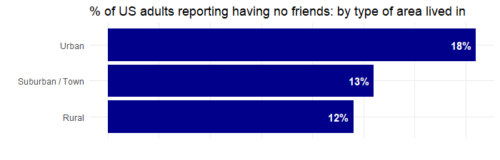 The traditionalist’s view that city living includes being surrounded by hordes of other people, but feeling personally lonely, seems directionally borne out in these results. Univariately at least, urban dwellers are more likely to report having no friends.