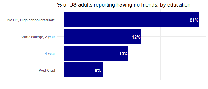 The big differences keep on coming! At a glance, this looks like a strong positive link between having higher levels of education and having a friend.