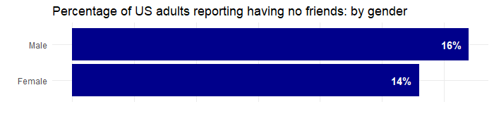 Not a whole lot to say here. Males seem slightly more likely to report having no friends than females, but the gender differences are much less than between generations. Without knowing the confidence intervals of the responses it’s also hard to know how significant these differences are.