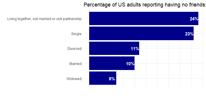 Are changes in the number of people reporting having no friends really a ‘cohort effect’, which is what a lot of the headlines about this survey imply? More data-digging would be needed to determine that, as opposed to whether this is, for instance, an aging effect.