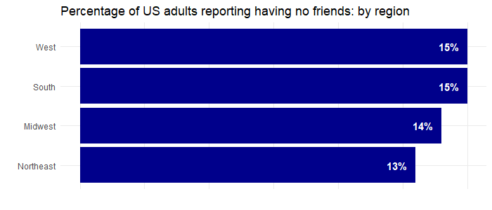 The difference between Black and White respondents – 16 percentage points – is actually the same level of difference as between Millennials and the generation with the very lowest % of people reporting having no friends.