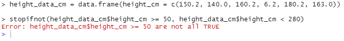 So if you do include the stopifnot line running the script returns an error, telling you that it’s not the case that the two conditions included in the parameters of the stopifnot command – that heights are greater or equal to 50cm or less or equal to 280cm – are all true..