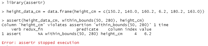 In R, one useful built-in base function for this is the stopifnot command. Enter a predicate into this function, and if when the code is run the predicate is not true, then it’ll call the stop function. This stops code execution and returns an error. A situation like that described above could potentially have been avoided via code like this: