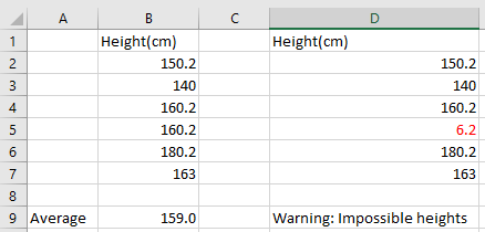 For example, if your height data was in Excel, then instead of calculating the average height via something like AVERAGE(A2:A7), you could introduce a check that would at least warn you if something was up via a formula involving the IF function. Ensuring the heights are within the bounds outlined above, and calculating the average only if they are, could be expressed in this way: