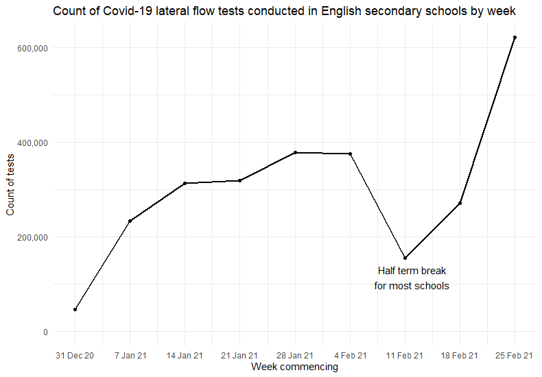The count of tests conducted has been rising over the weeks, with the exception of a dramatic but predictable drop during the weeks affected by the half term holidays. Most schools went on half term for a week from February 12th, although there will likely be some variation between schools on that. In the last week of data available, post-half-term, a new high of 622,861 tests took place.