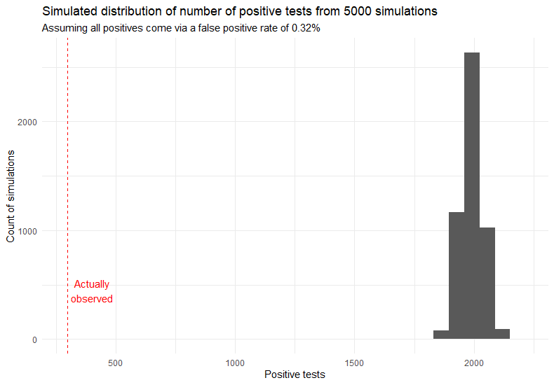 Now we see that the 297 positives shown in the data was very unusually high, if in reality the FPR was 0.03% and all our positive cases were down to false positives. The maximum number of positive cases found in any of the 5000 simulations here was 238, substantially below the 297 actually observed in the data.