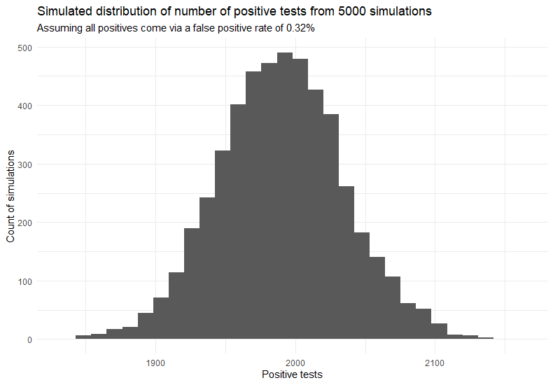 So how unlikely is it? There’s many ways one could approach that question. Here I’m going to use a simulation. I’ll model the positive test result from a test as having a Bernoulli distribution and simulate 621,830 tests each with an individual probability of 0.32% of being positive, i.e. the false positive rate – recalling that here we are pretending there’s no chance of a true positive result for Covid. As the Bernoulli distribution is a special case of the binomial distribution, in R we can do this with a quick deployment of the rbinom() function.