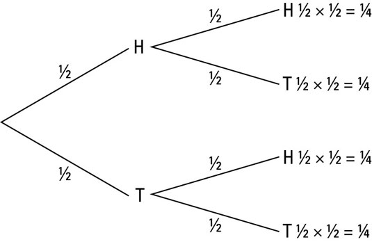 For any overall outcome (HH, HT, TH, TT) you can then use the general multiplication rule to calculate the probability of the outcome of two independent things as being the probability of the first multiplied by the probability of the second. In tree form, that’s starting at the left, following the relevant branches, and multiplying the probabilities together. So for this example: 0.5 * 0.5 = 0.25, or 25%.