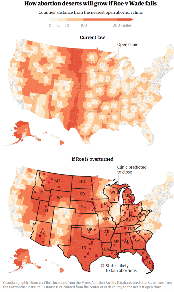 The Guardian published an informative visualisation of how the US “abortion deserts” would likely dramatically grow if Roe vs Wade is overturned.