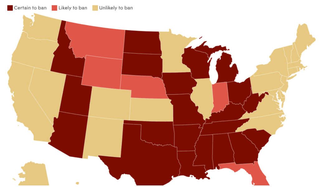What is fairly guaranteed though is at least some of what will happen next if this overturn does happen. The reversal of Roe vs Wade doesn’t itself doesn’t restrict abortion directly. But several states have already passed heavily restrictive abortion laws or bans that will be enacted right away if Roe vs Wade falls. It’s thought that 26 states are likely to ban abortion in one way or another.