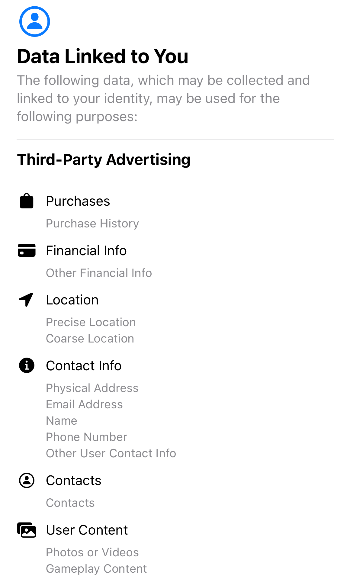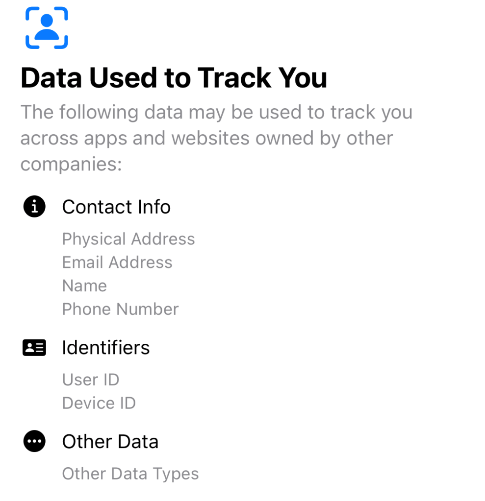 In the iOS app store, many apps now have an “App Privacy” section that details what data the app collects and uses. I was going to share the one for Facebook below, but it’s so many screens full of information that I’ll just share the top couple. There’s far more below what’s displayed here.