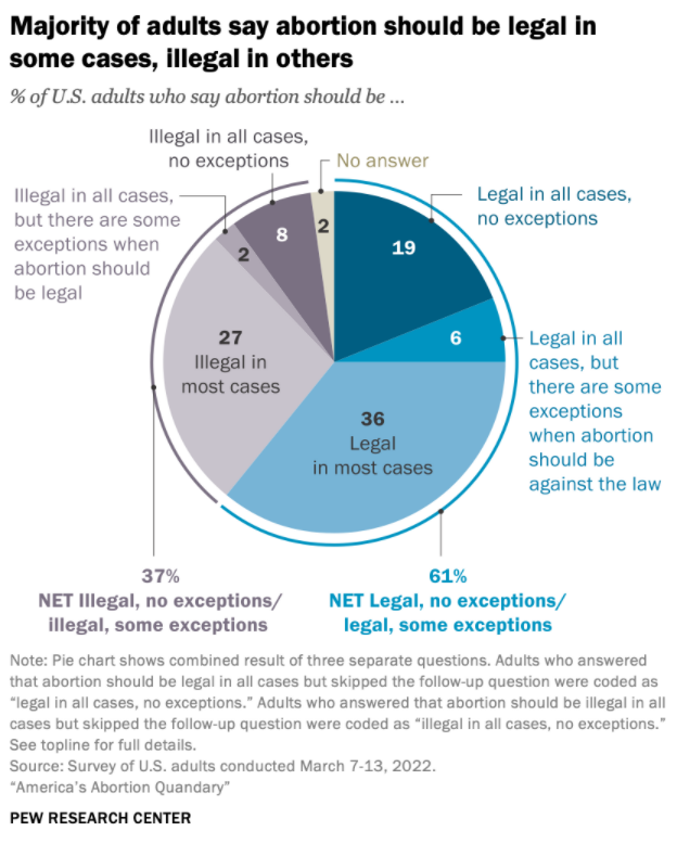 The Pew Research Centre reports that 61% of Americans believe that abortion should “be legal in all or most circumstances”. Only 8% of the surveyed population thought that abortion should be illegal without exception. And plenty of people had a far more nuanced view than the stereotype of the (appallingly-named, in my opinion) “pro-choice” vs “pro-life” argument would suggest.
