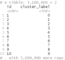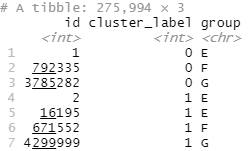 Having now created a dataset with groups E, F and G – E has 100k participants, F and G both have 2.5 million each – we can use the sc_clustering function to do the hard work here.