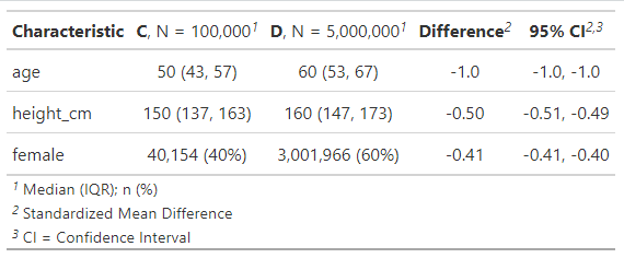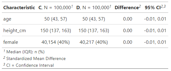 Just as expected, group b participants are on average roughly 10 years older, 10 cm taller and 20 percentage points more likely to be female that group A participants. The “Difference” column is showing the standardised mean differences, and they’re all a lot bigger than 0.1.