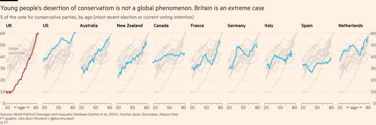 The same FT article also reports that cultural and economic beliefs of the typical young person are now very different from those of the typical Conservative voter according to survey data.