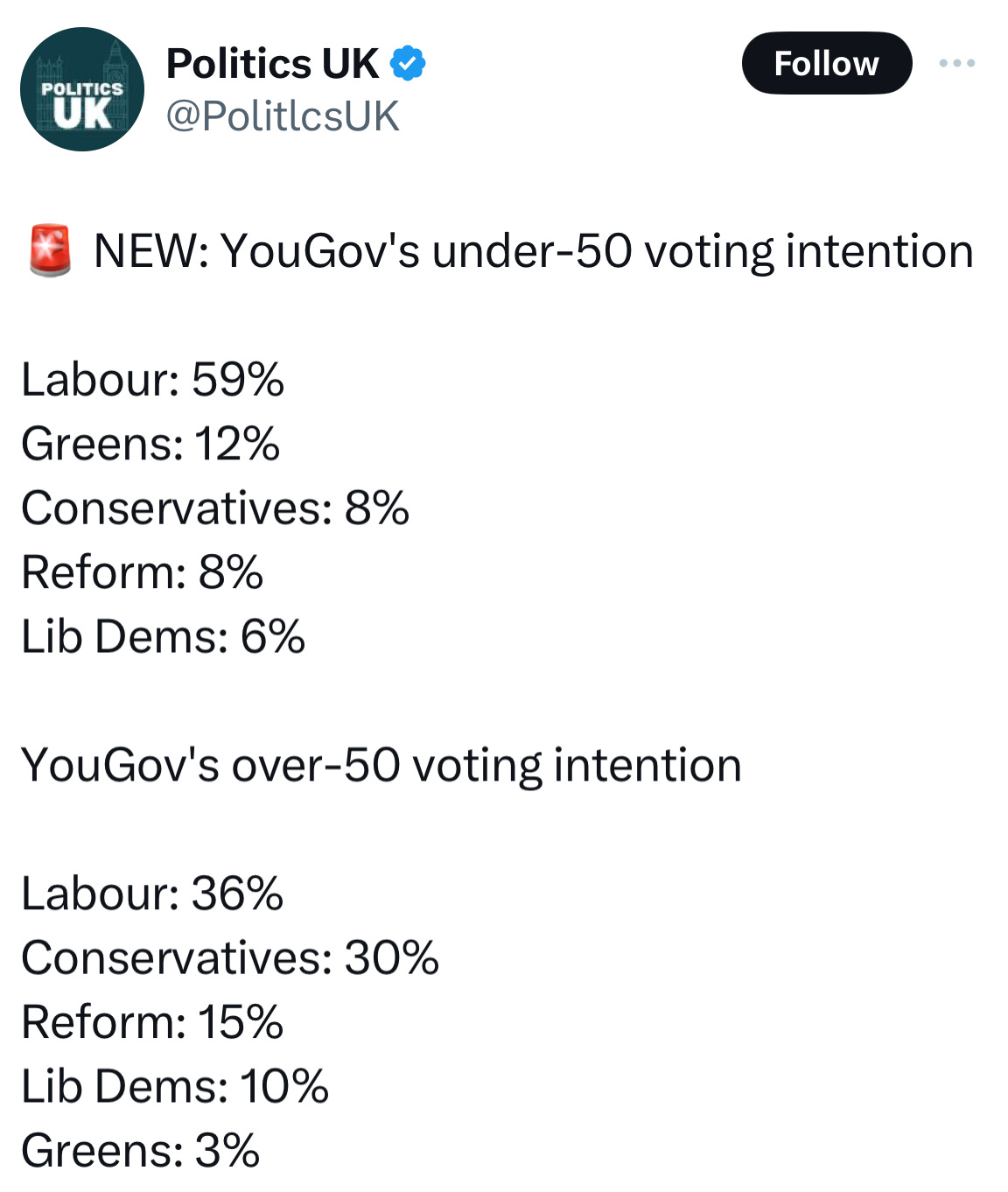 Ansell highlights the results of a Yougov poll done at the end of May 2024 that showed the rather remarkable result that only 8% of voters under the age of 50 intend to vote for Conservatives.